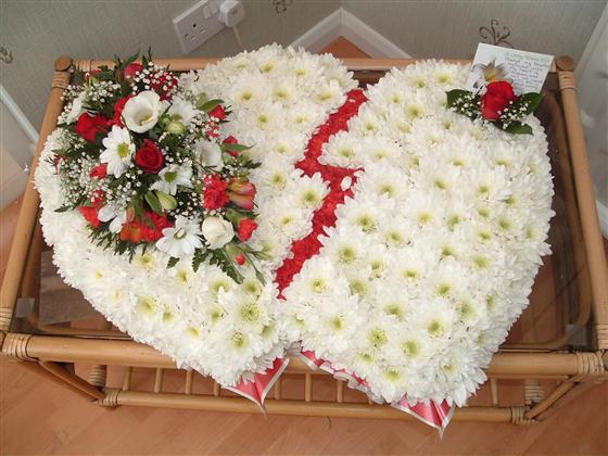 A beautiful tribute for the broken hearted. The hearts are in white with colour varients for the flower sprays and ribbons. A name can be placed across the tribute on a ribbon. Please state on ordering.