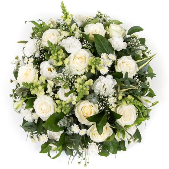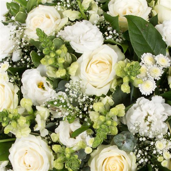 A collection of white and cream flowers with roses, million star and variegated greenery combine to create a simple and beautiful tribute.
