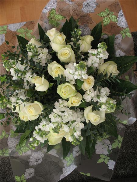 A Stunning bouquet which combines white roses and stocks brought together with a selection of delicate greenery. This bouquet will make any room smell beautiful with its sweet fragrance.