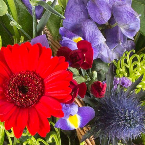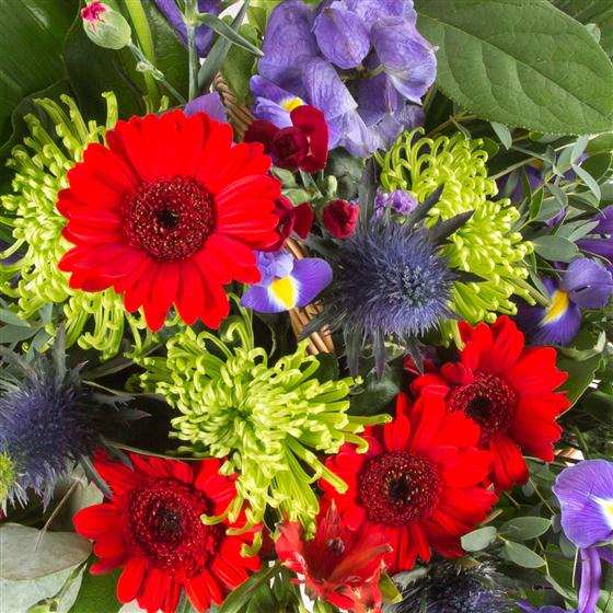 A classic basket and modern blooms fuse together to create a vibrant red, purple and lime display. basket may be diff to pictures