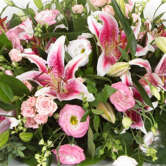 A selection of pink blooms in a variety of shades including sweet spray roses, larkspur and stargazer lilies.