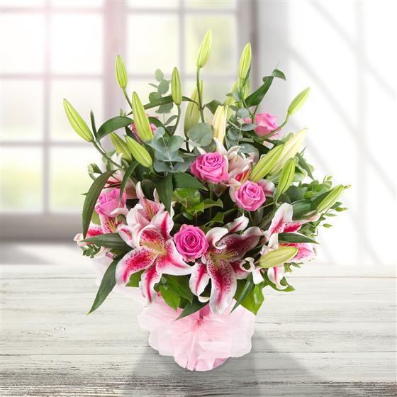 Pink roses and pink stargazer lilies combined with palm leaves and eucalyptus create a pretty array that is a joy to the senses.