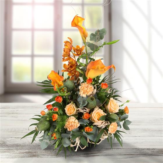 An exotic mix of peaches, oranges and limes including mango calla lilies and spray roses.
