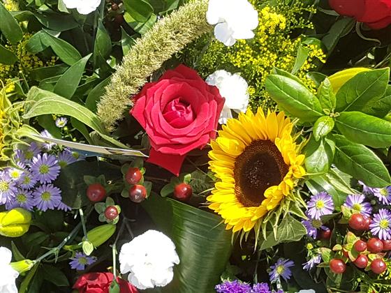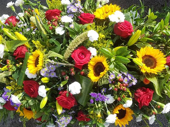 A lovely tribute of autumnal flowers including vibrant sunflowers i prefect tribute to your loved one