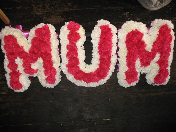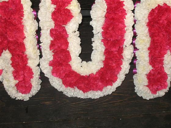 each letter is packed full of carnations which can be any colour you want that is available at the time of ordering