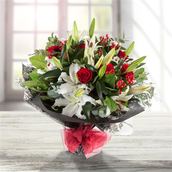 An beautiful display of highly fragranced white lilies and fabulous red roses mingled with a variety of foliage and berries.
